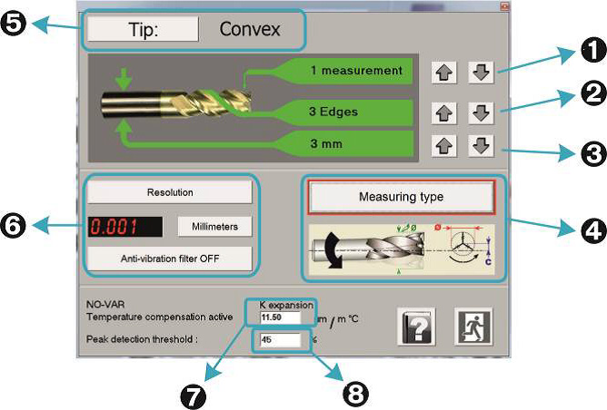 Bei komplexen Messverfahren an Werkzeugen, die zudem von unterschiedlichen Bedienern auszuführen sind, ist es vorteilhaft, wenn das Messgerät zusammen mit einem fest integrierten Computer arbeitet und den Bediener über eine grafische Oberfläche die einzustellenden Charakteristika wie zum Beispiel die Anzahl der Schneiden abfragt.