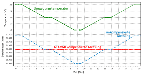 Bei jedem Messprozess muss ständig der Effekt der Temperatur berücksichtig werden, sowohl mit den Auswirkungen auf das Messgerät als auch die des zu messende Teils. Selbst wenn Sie ein „perfektes“ Messgerät haben das die Ausdehnungen der Raumtemperatur kompensieren kann, muss der Temperatureffekt des Werkstückes berücksichtigt werden. Zum Beispiel ist bekannt, dass eine Temperaturdifferenz von 10°C eine Maßänderung von 3,6 µm an einem 30 mm Teil nach sich zieht, bei einem Ausdehnungskoeffizient von +0,012 mm/°C . In der Praxis bedeutet das, dass Sie zu dieser Ausdehnung noch den thermischen Fehler des Messgerätes hinzurechnen müssen, welcher in der Regel nicht bekannt und nicht genau reproduzierbar ist. Daraus resultierte, dass bis jetzt niemand in der Lage war, wenn in abweichender Temperatur von der Referenztemperatur (20°C) gemessen wurde, mit akzeptabler Genauigkeit den Messfehler zu bestimmen. Der einzige Weg, dieses Problem zu umgehen, war die permanente Rekalibrierung des Messgerätes mit einem Meisterstück, hergestellt aus dem identischen Material wie das zu messende Teil und immer gelagert in der Nähe des Messgerätes und der Teile die gemessen werden müssen.