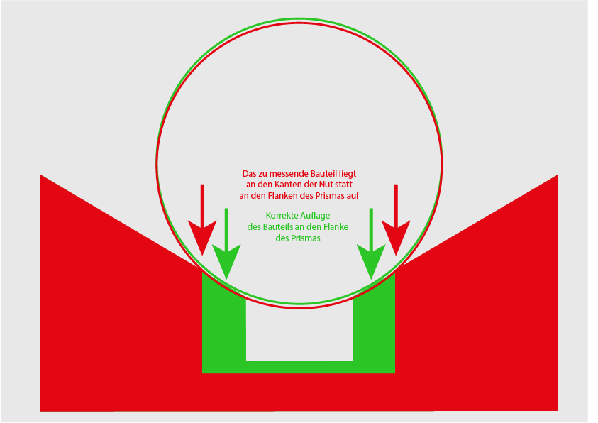 prisma-auflagepunkte-1Deshalb suchten wir nach einer anderen Lösung und fügten in die Kreissehne am Boden des Prismas eine feine Nut ein. In dieser Vertiefung lagern sich jetzt die Schmutzpartikel ab und beeinflussen dadurch nicht mehr das Messergebnis. Doch das war einfacher „gedacht als gefertigt.“ Denn bei einem Radius der Stifte von nur 0,4 mm darf die Nut am Boden der Kreissehne nur über eine Breite von maximale 0,2 mm verfügen, damit das zu messende Bauteil nicht auf den Kanten der Nut (roter Teil der Grafik), sondern an den Flanken des Prismas (in der Grafik grün dargestellt) aufliegt und es dadurch nicht zu einer falschen Positionierung kommt. Um eine so feine Nut zu erzielen, wurde die Nut in dem aus Edelstahl bestehenden Prisma nicht geschliffen oder gefräst, sondern erodiert, weil nur das Erodieren eine so feine Bearbeitung des Stahls zulässt.